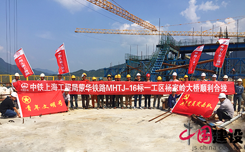 9月7日,經參建人員近5小時的連續奮戰,由中鐵上海局蒙華鐵路MHTJ-16標段一工區承建的楊家嶺大橋中跨合龍段混凝土順利澆筑完成,標志著蒙華鐵路晉豫管段唯一左右分幅、斜跨三淅高速公路、采用菱形掛籃懸臂灌注法施工、最大跨度連續梁大橋——楊家嶺大橋順利合龍。